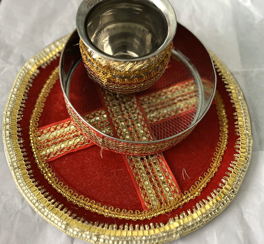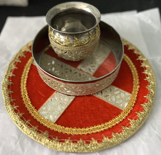Red Velvet Golden Colored Zari Karwa Chauth Thali