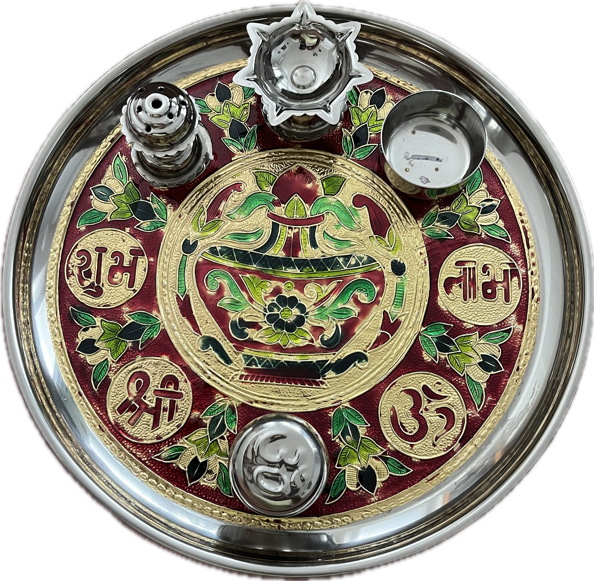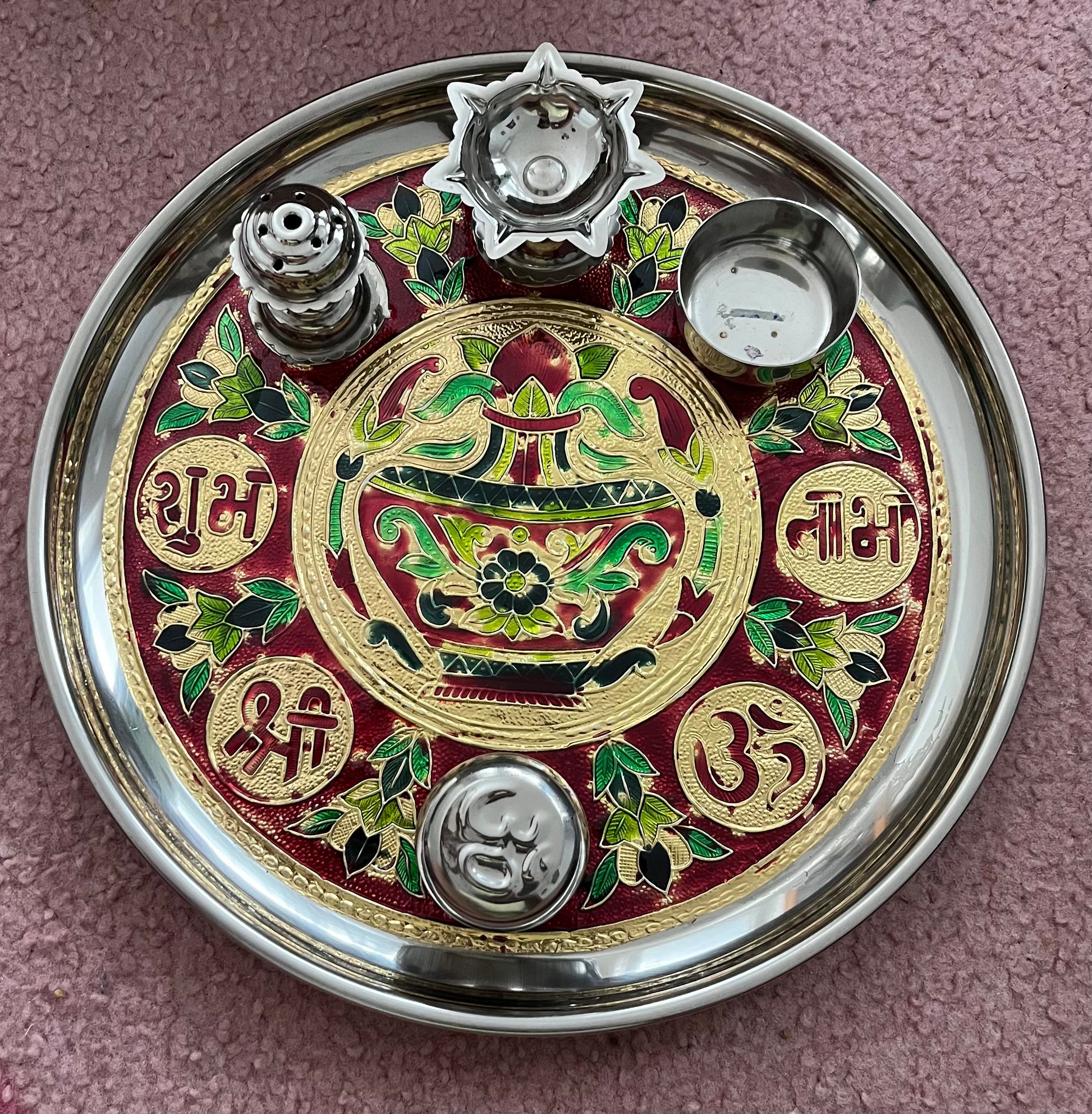 Aarti Thali Steel Plate With Stand Diya Kumkum Agarbatti 10 Inches Puja Thali Religious Item Meenakari Pooja Thali Decorative Plate