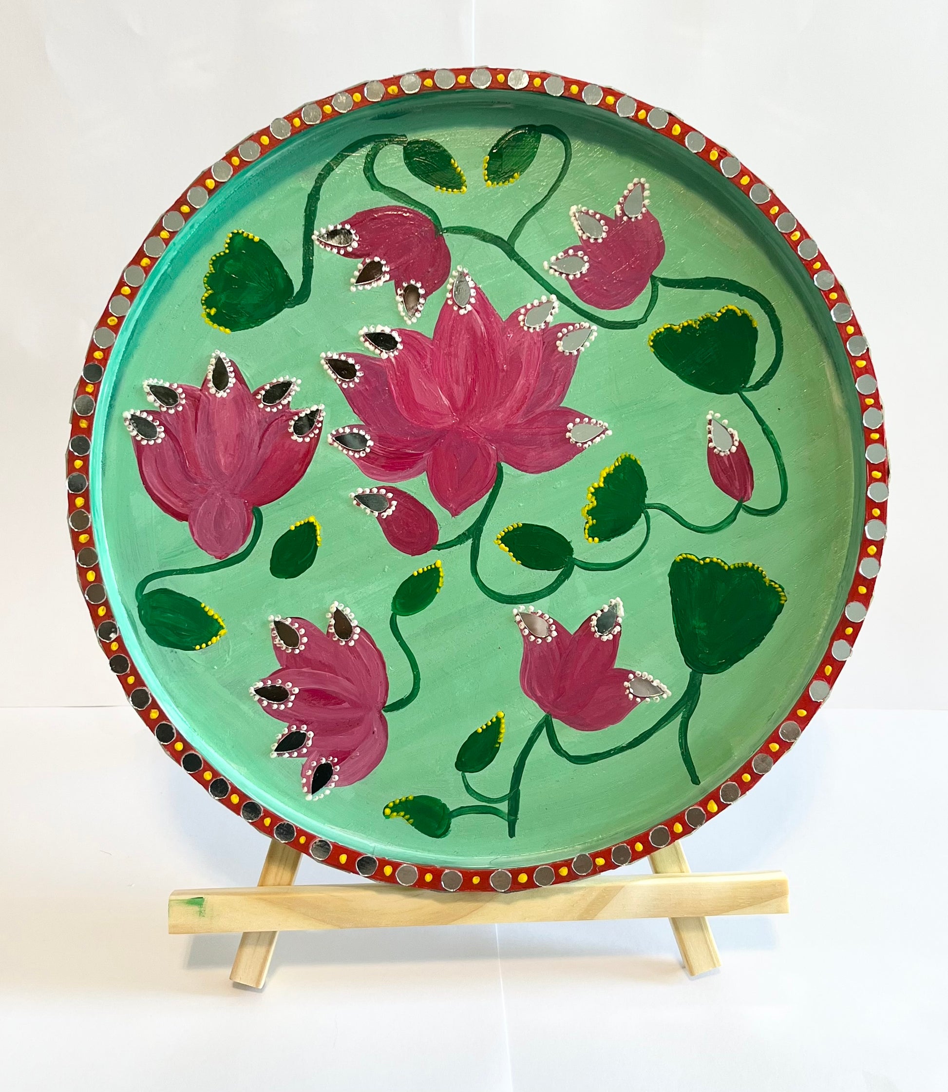 Vibrant colourful Pichwai art engraved in table tray with vibrant colours and mirror gives elegant look to your living room/study room.