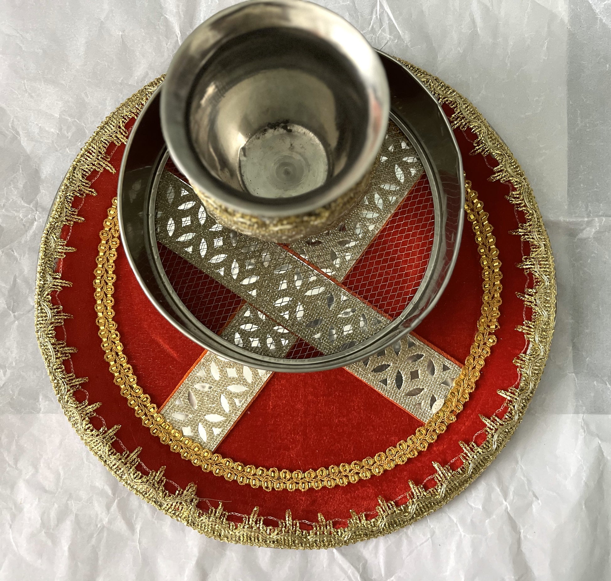 Beautiful Karwa Chauth thali set in red velvet and golden zari design.