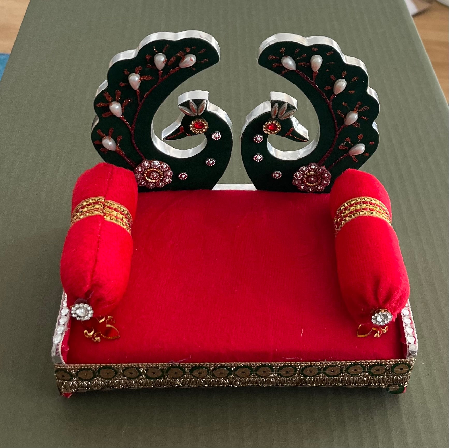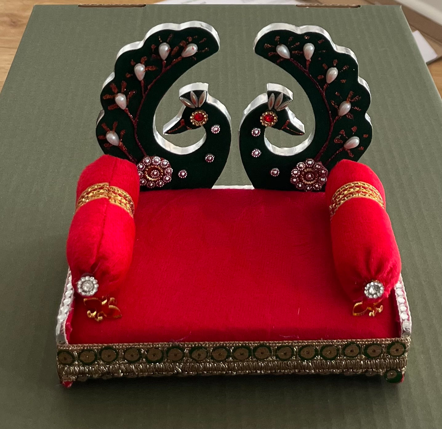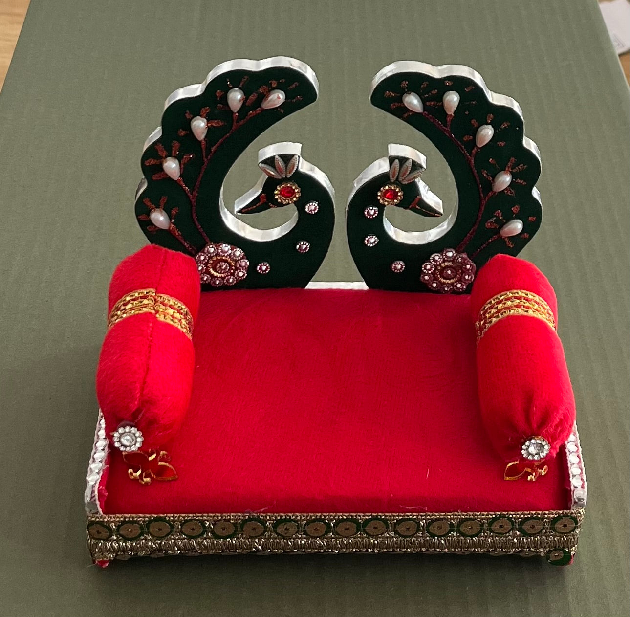 Sinhaasan in red velvet with peacock design engaraved in the back. Two red pillow is attached.