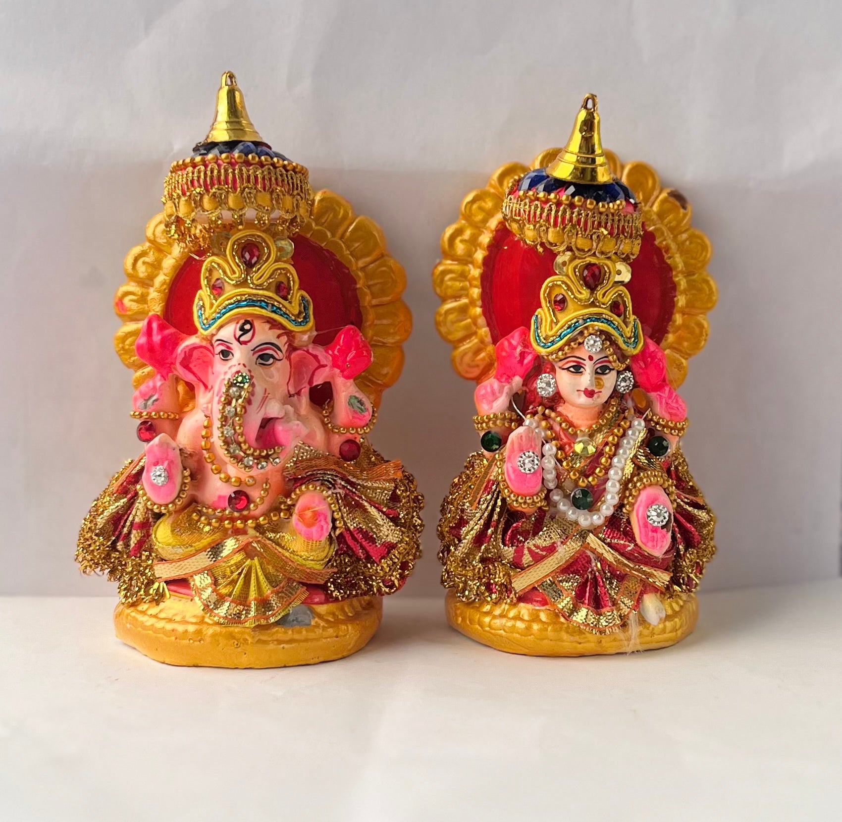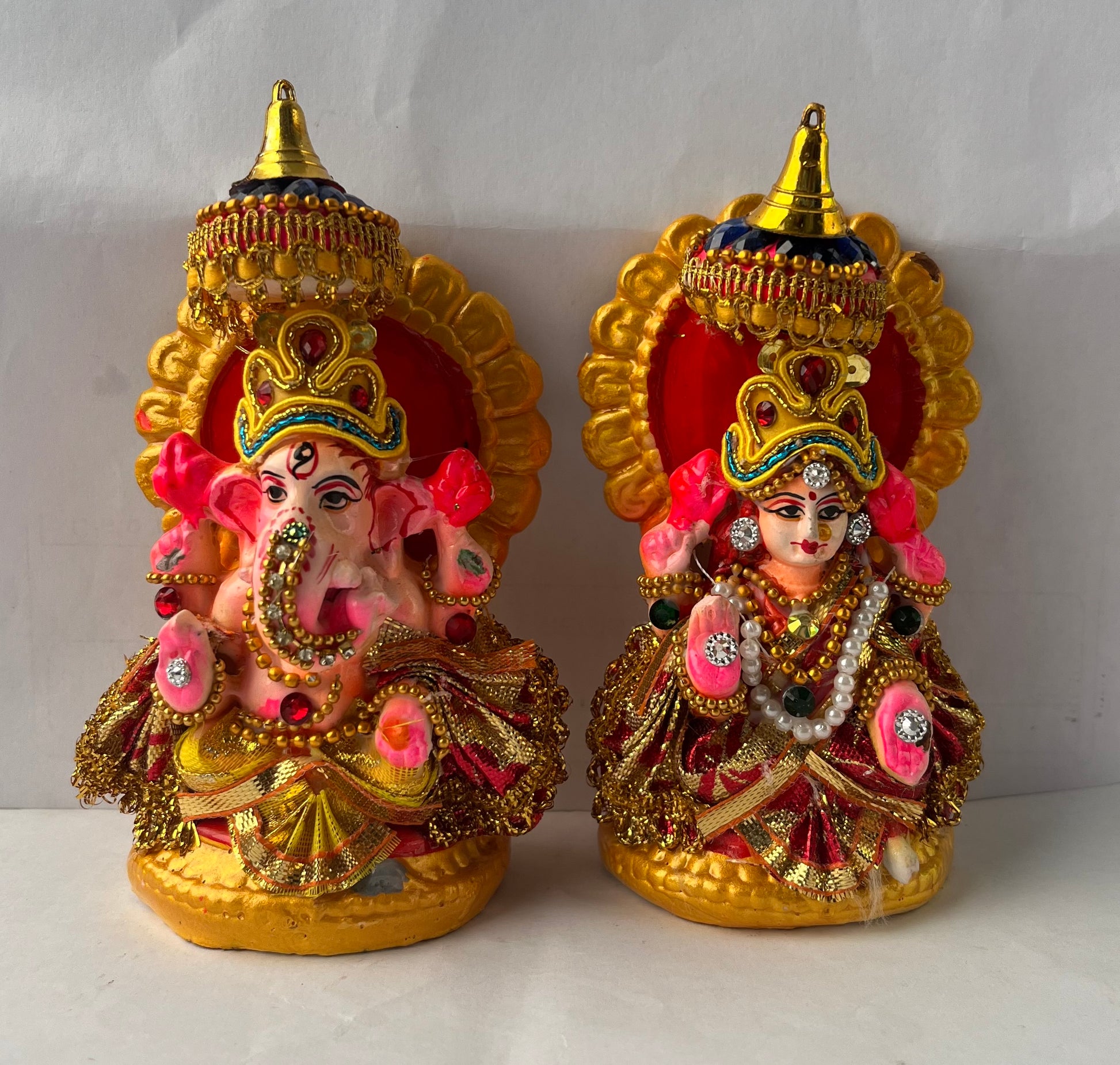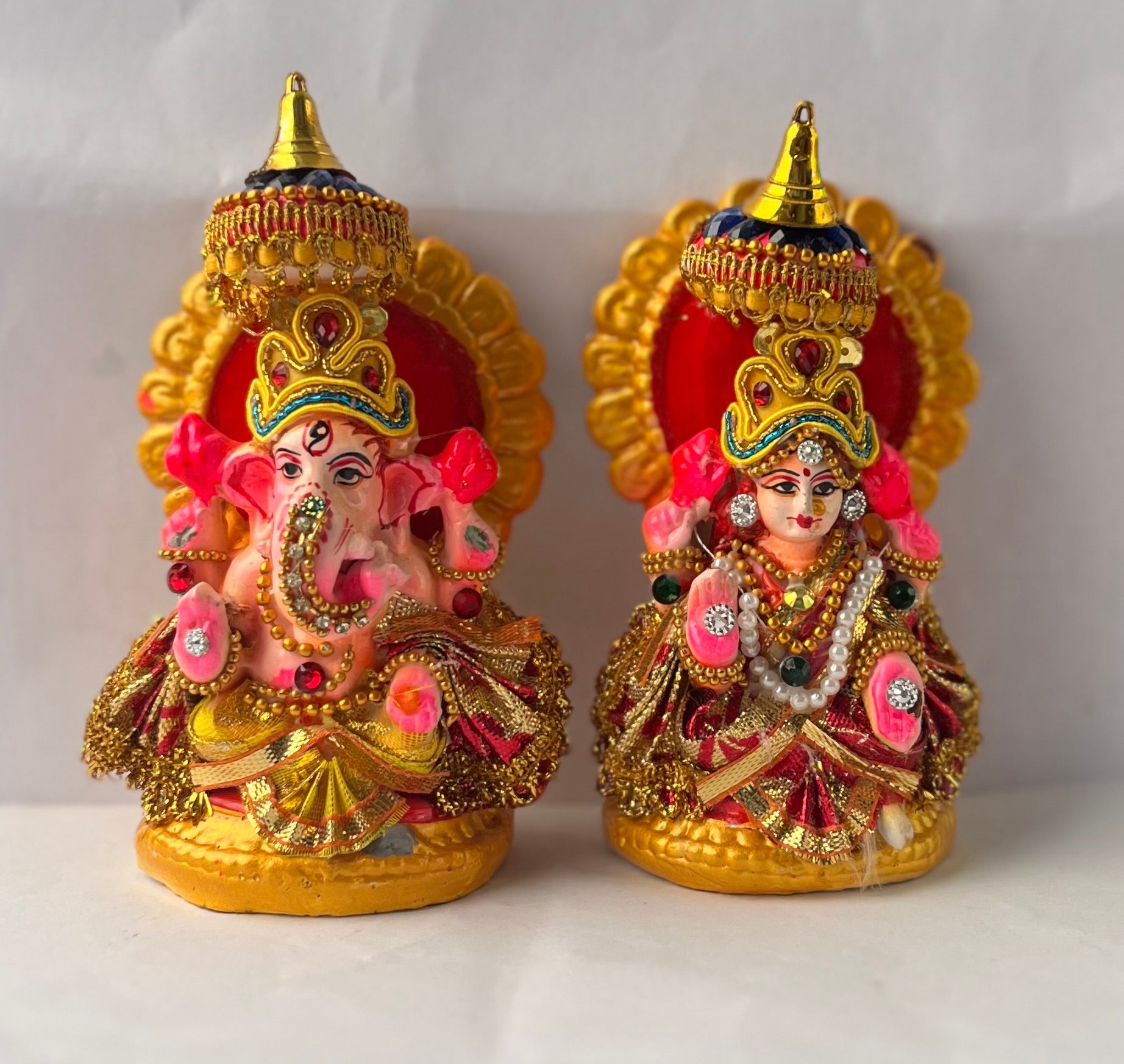 Lord Laxmi Ganesh 10 cm Murti Mitti Terracotta Clay idol with attached vastra, mala, jewellery.