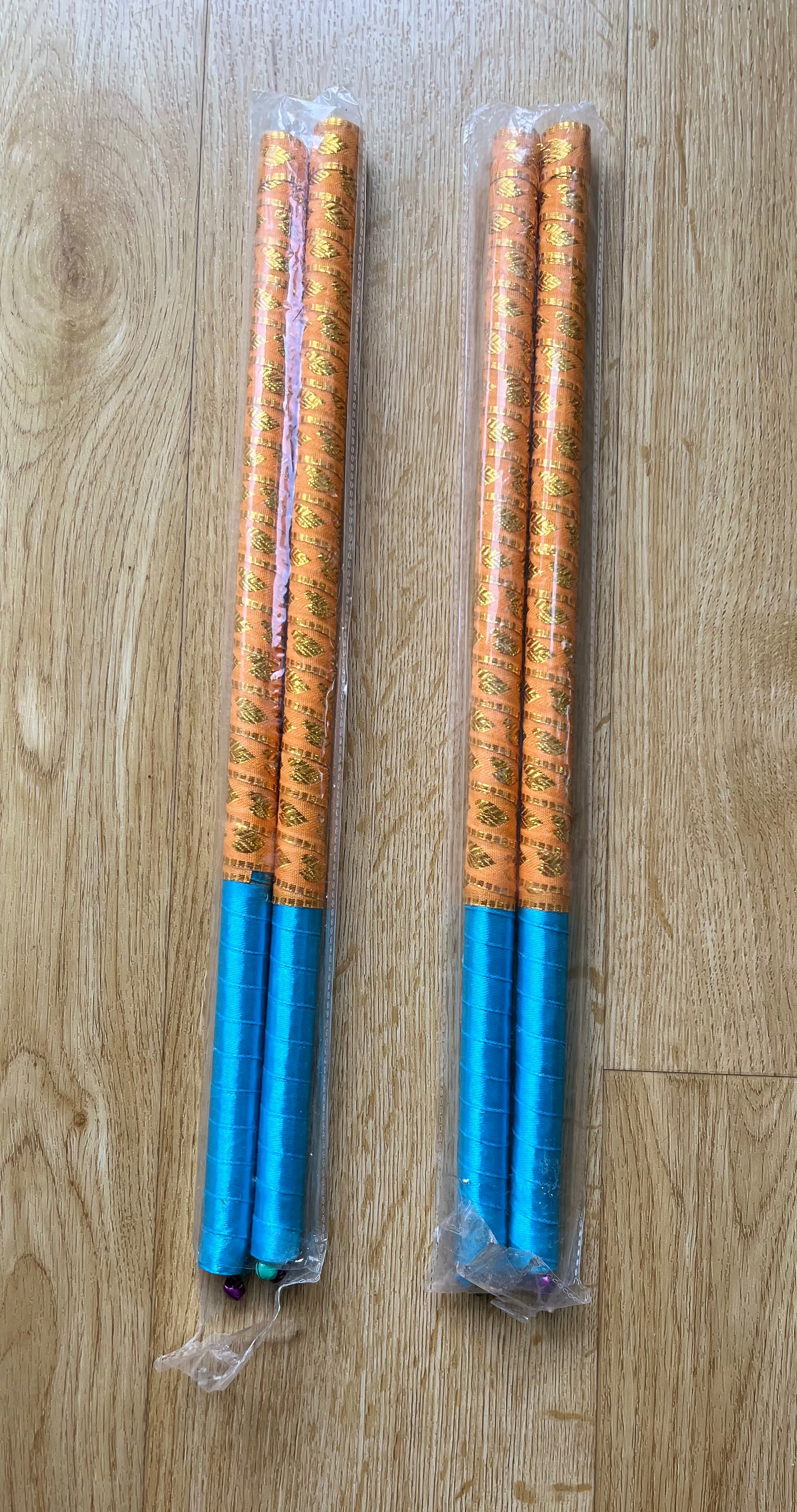 Orange Golden Designer Handmade Navratri Festival Dandiya Wooden Sticks, which is used for Garba/Navratri festival/Wedding occasion/mata chowki/or in ras garba nights or for Indian occasions.