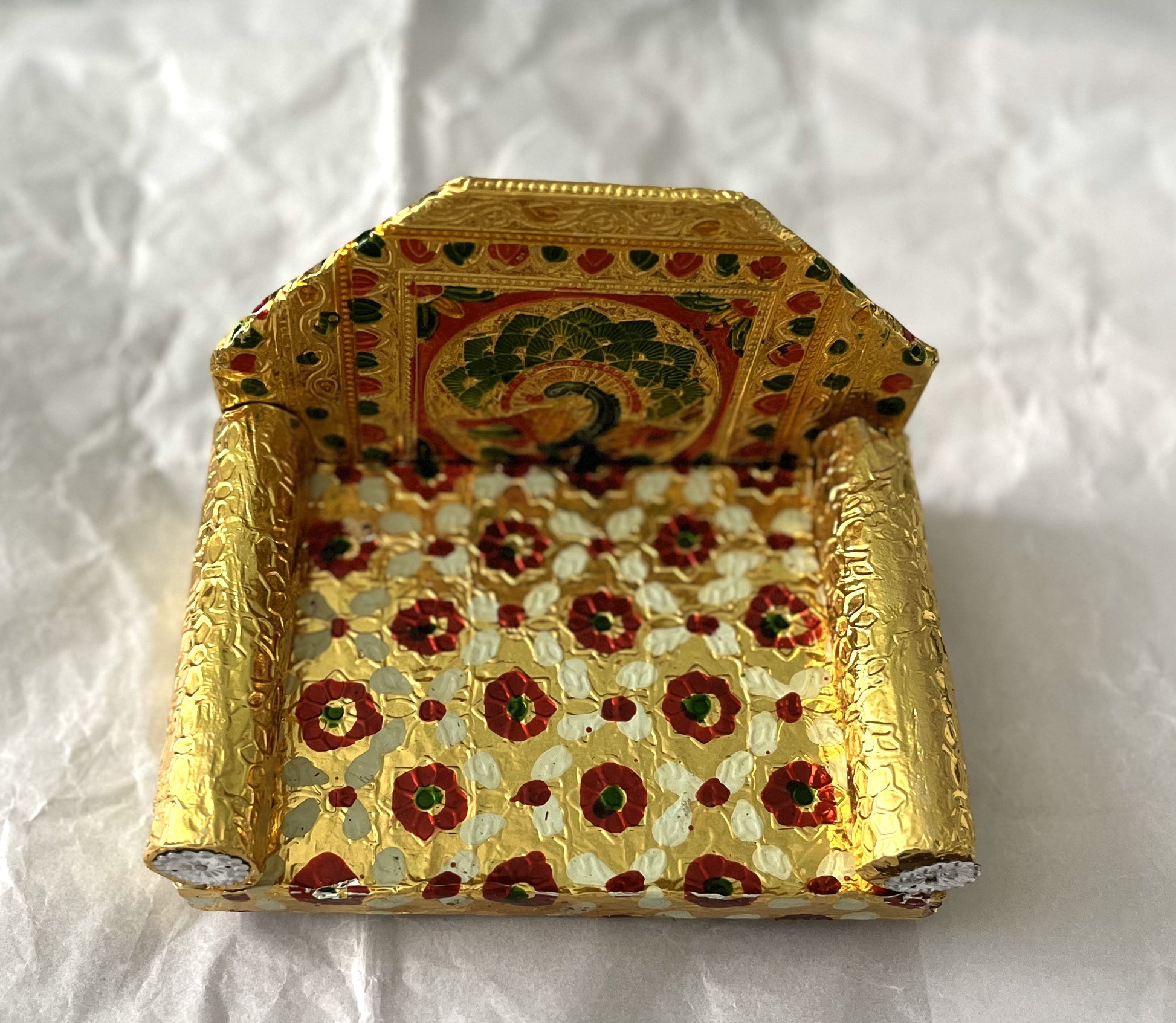 It is designed with a meenakari design peacock and red flower and made with red velvet cloth.