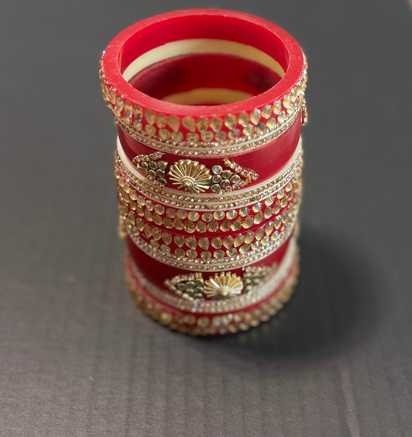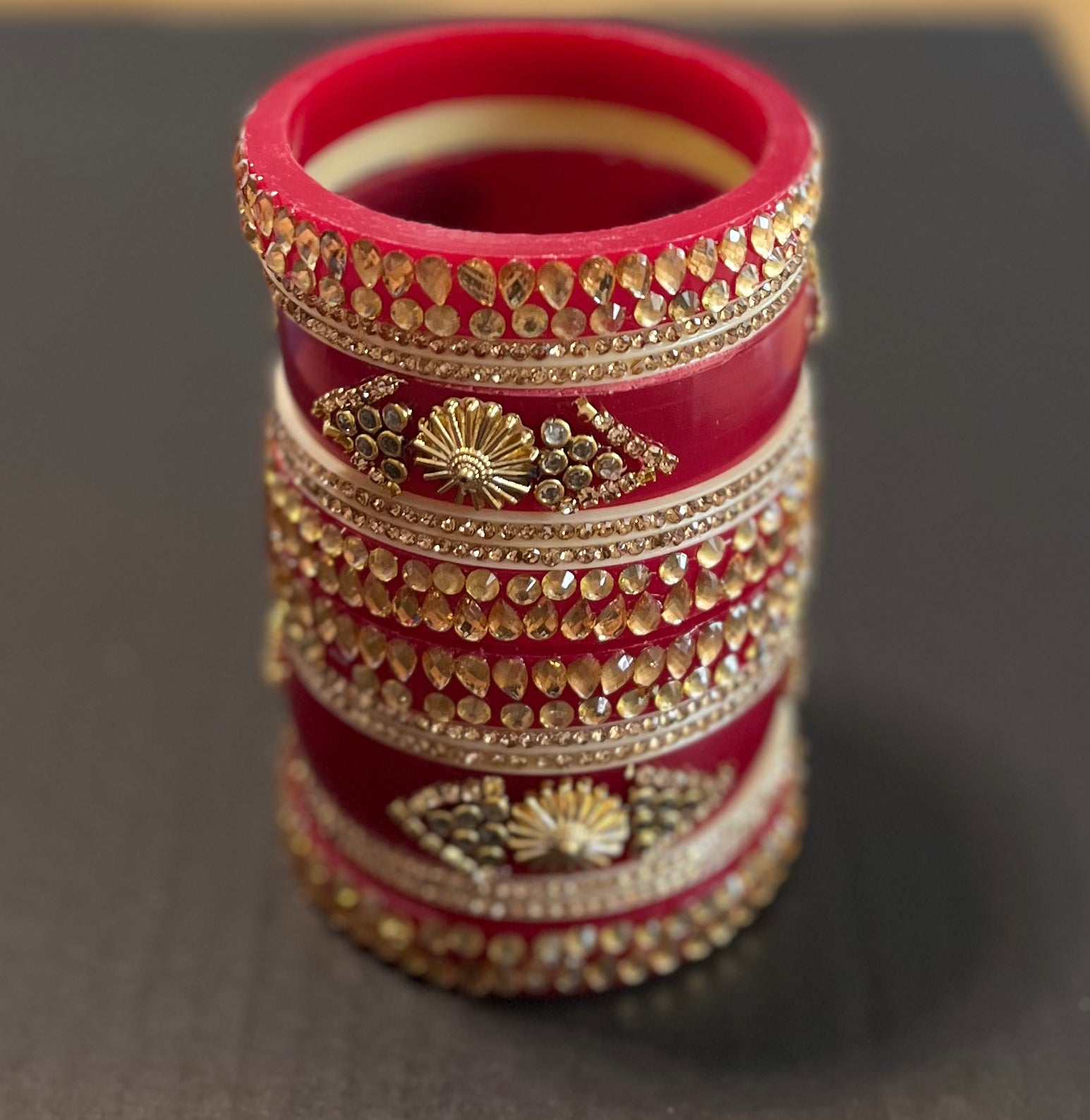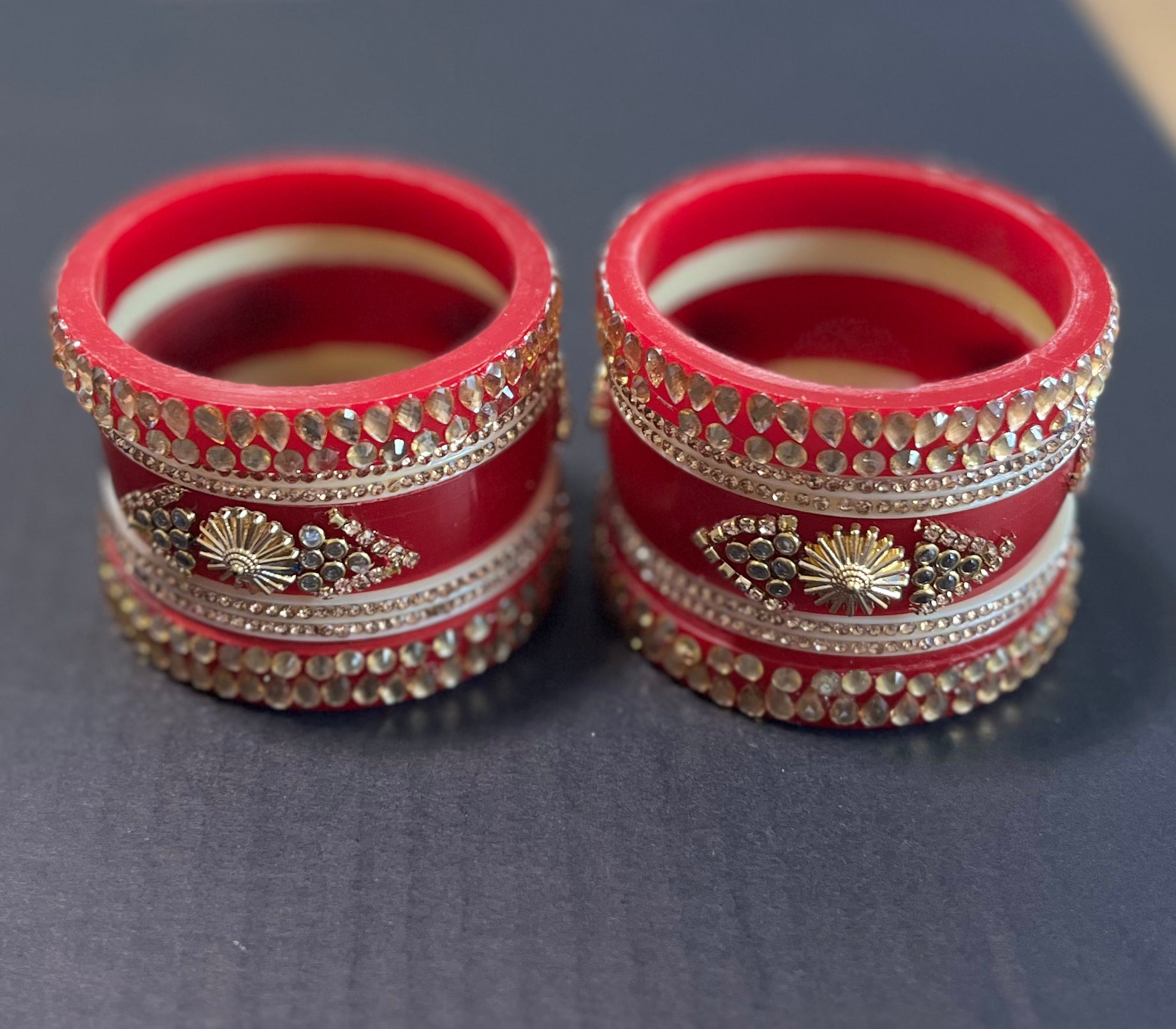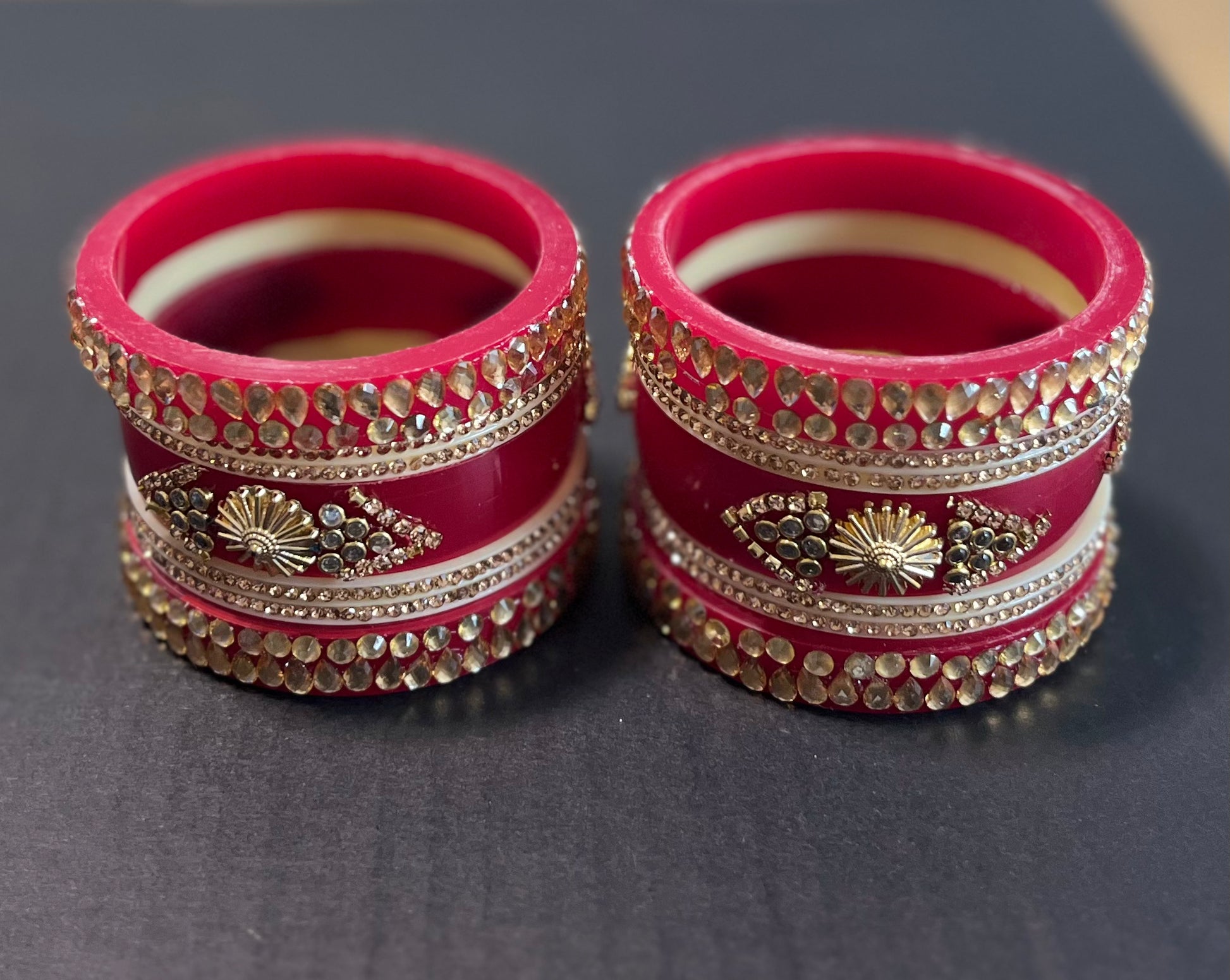 Beautiful red golden Kundan kangan set. Each hand has one big central kangan and 2 bangles both side