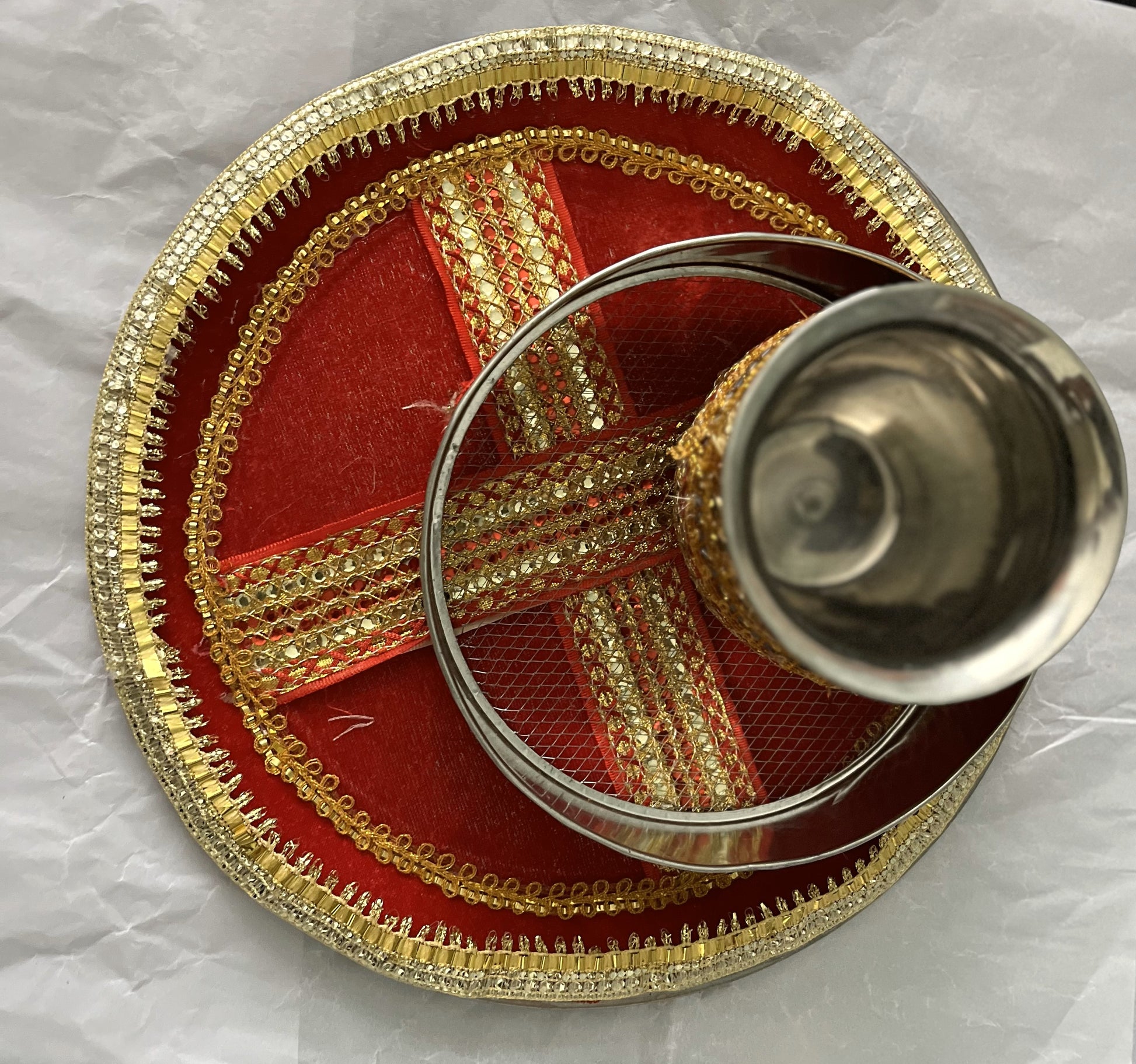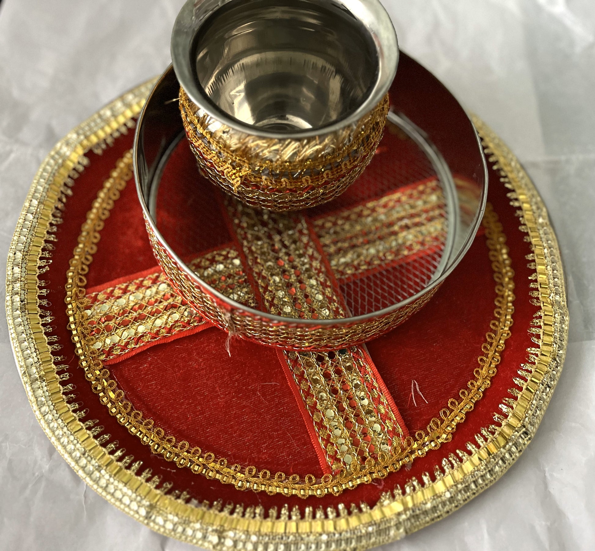 Beautiful Karwa Chauth thali set in red velvet and golden zari design.