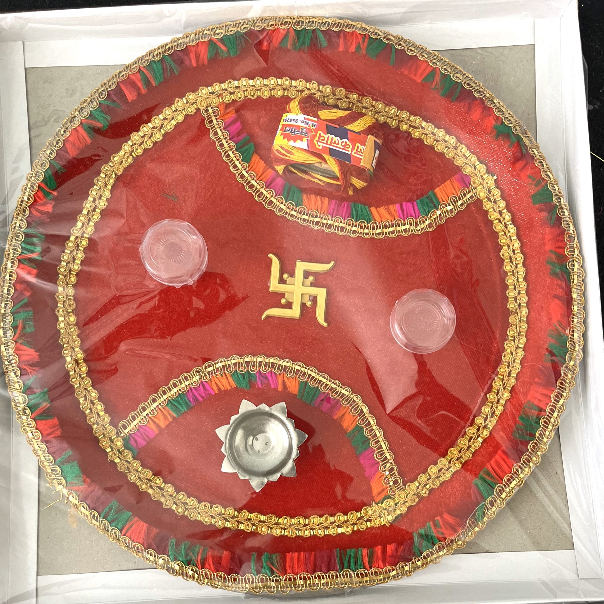 Beautiful Design Puja Thali in red velvet and red-green lace design with Swastik