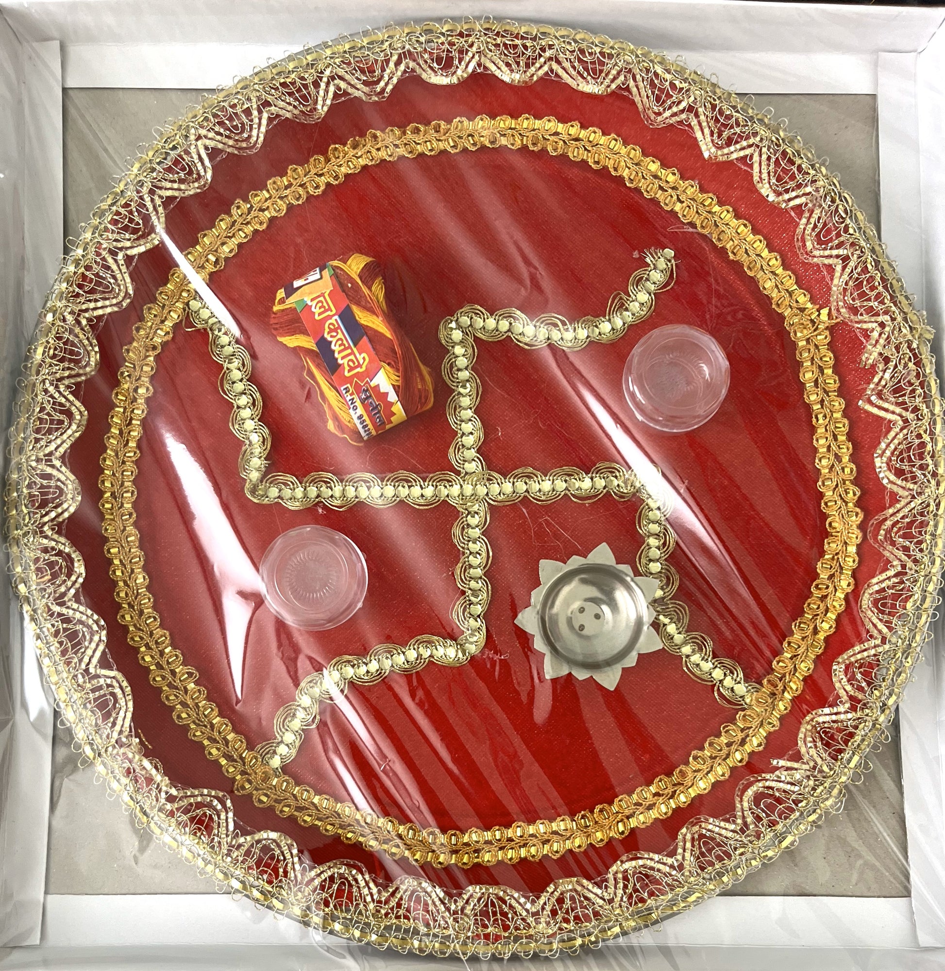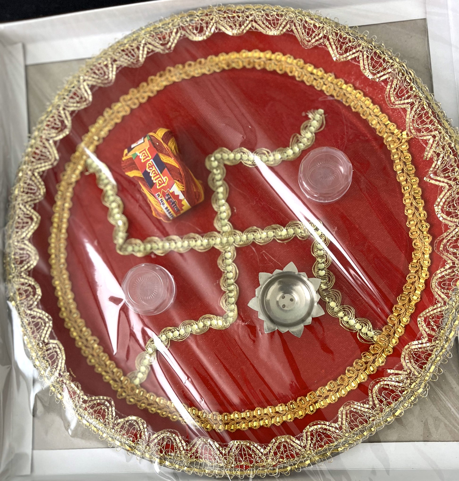 Red Golden Velvet Swastik Puja Thali (30cm)