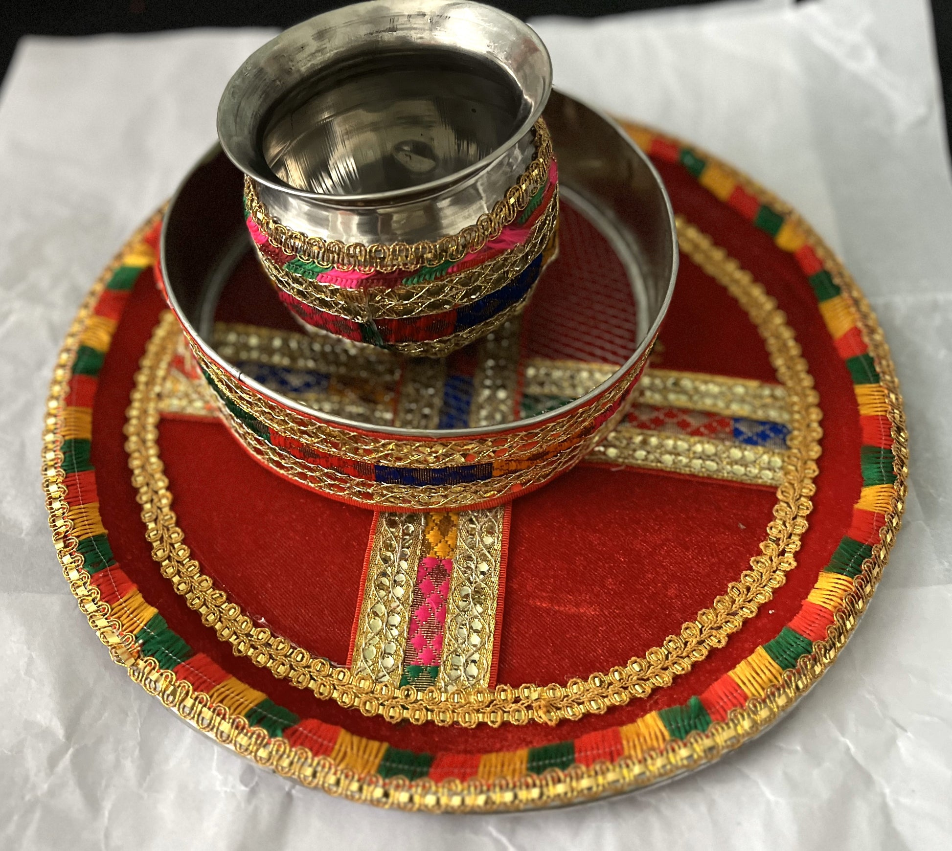 Beautiful Karwa Chauth thali set in red velvet and golden zari design.