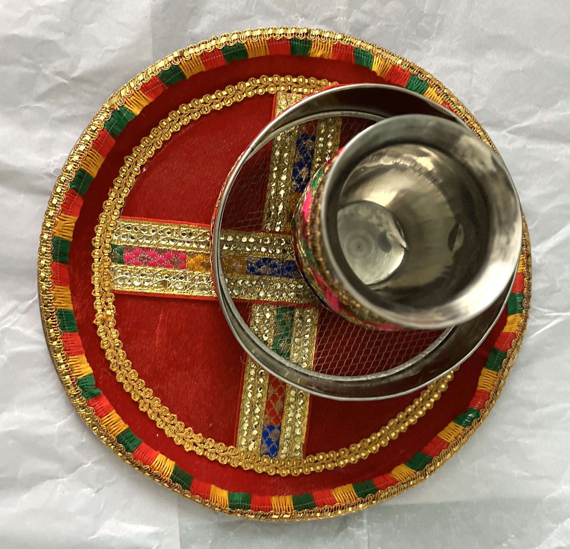 Red Velvet Golden Colored Zari Karwa Chauth Thali