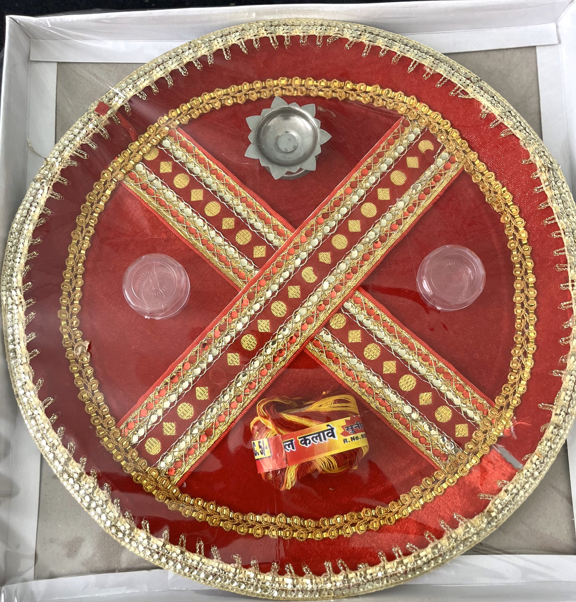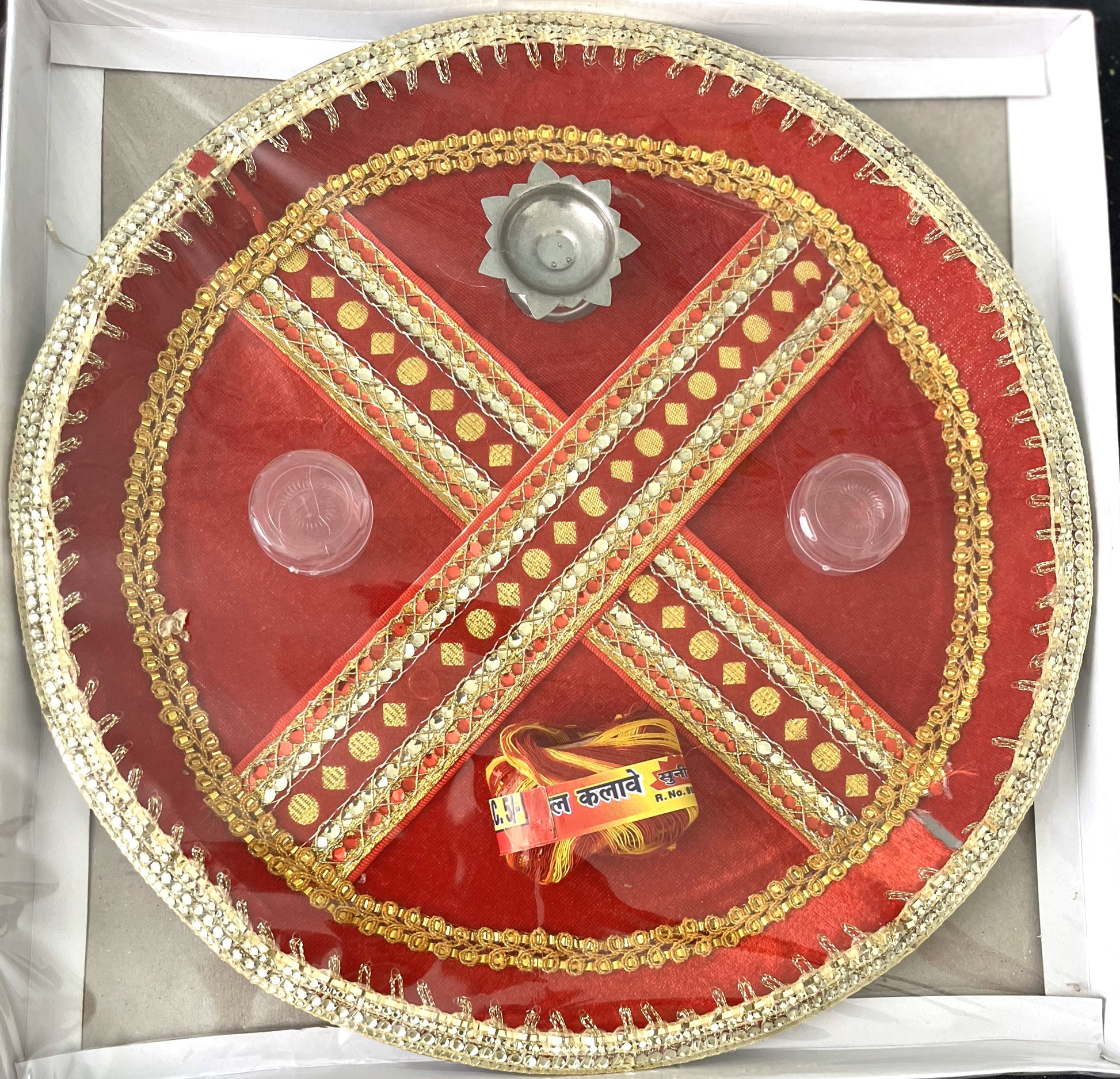 Beautiful Design Puja Thali in red velvet and golden gota patti design.