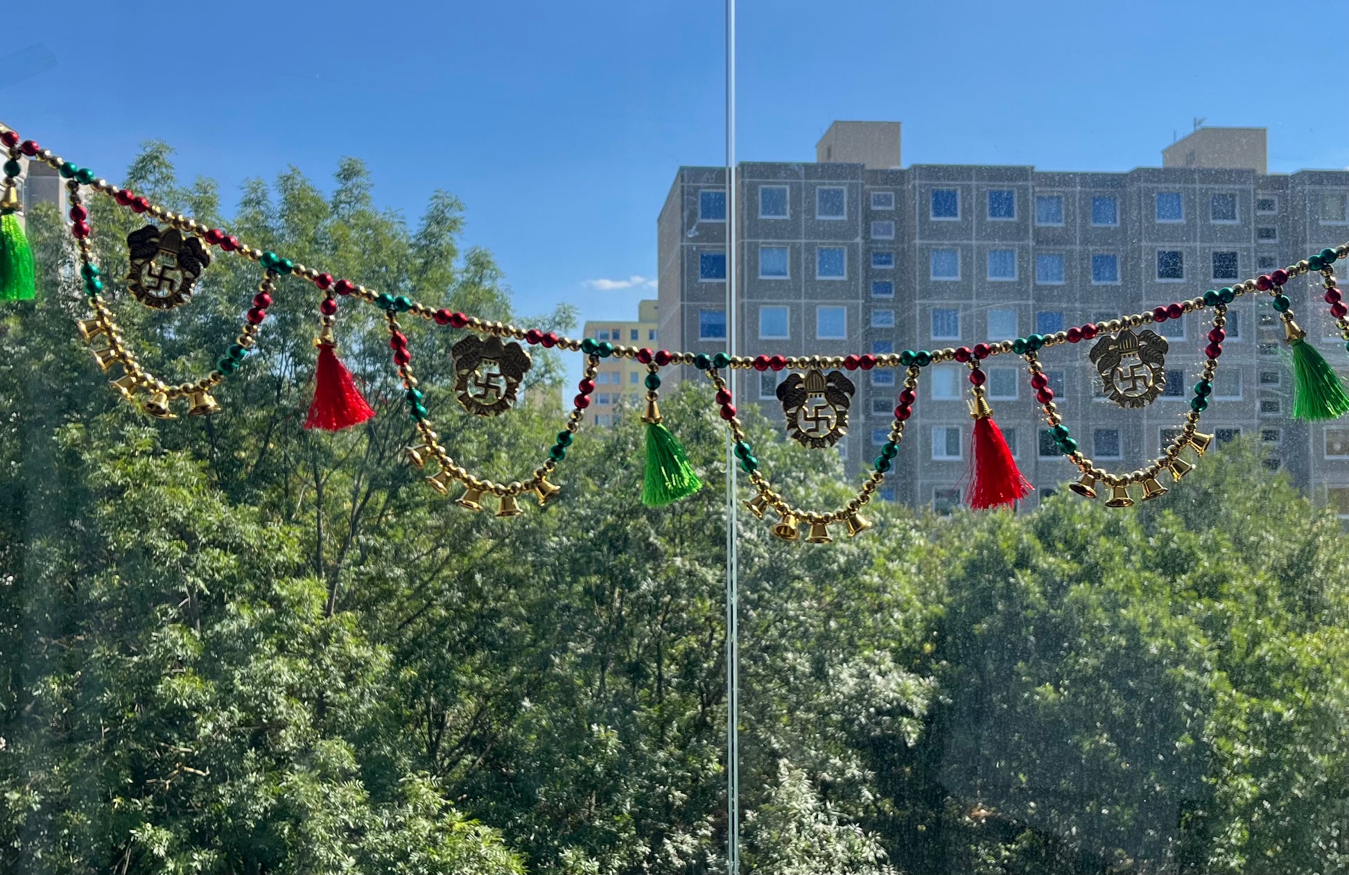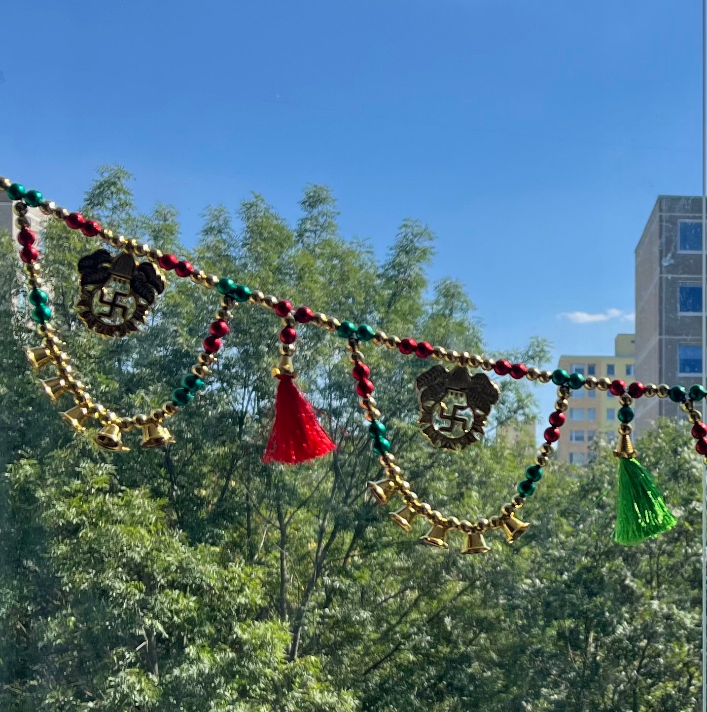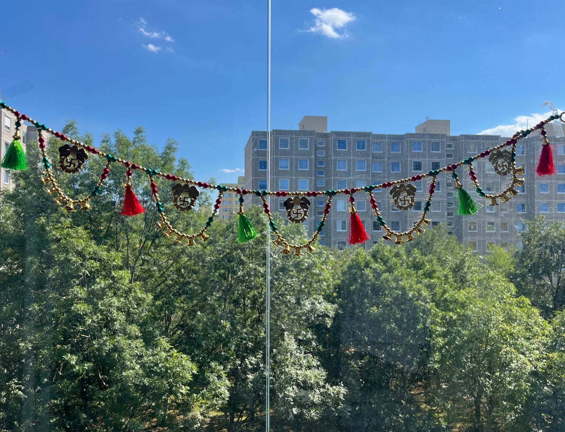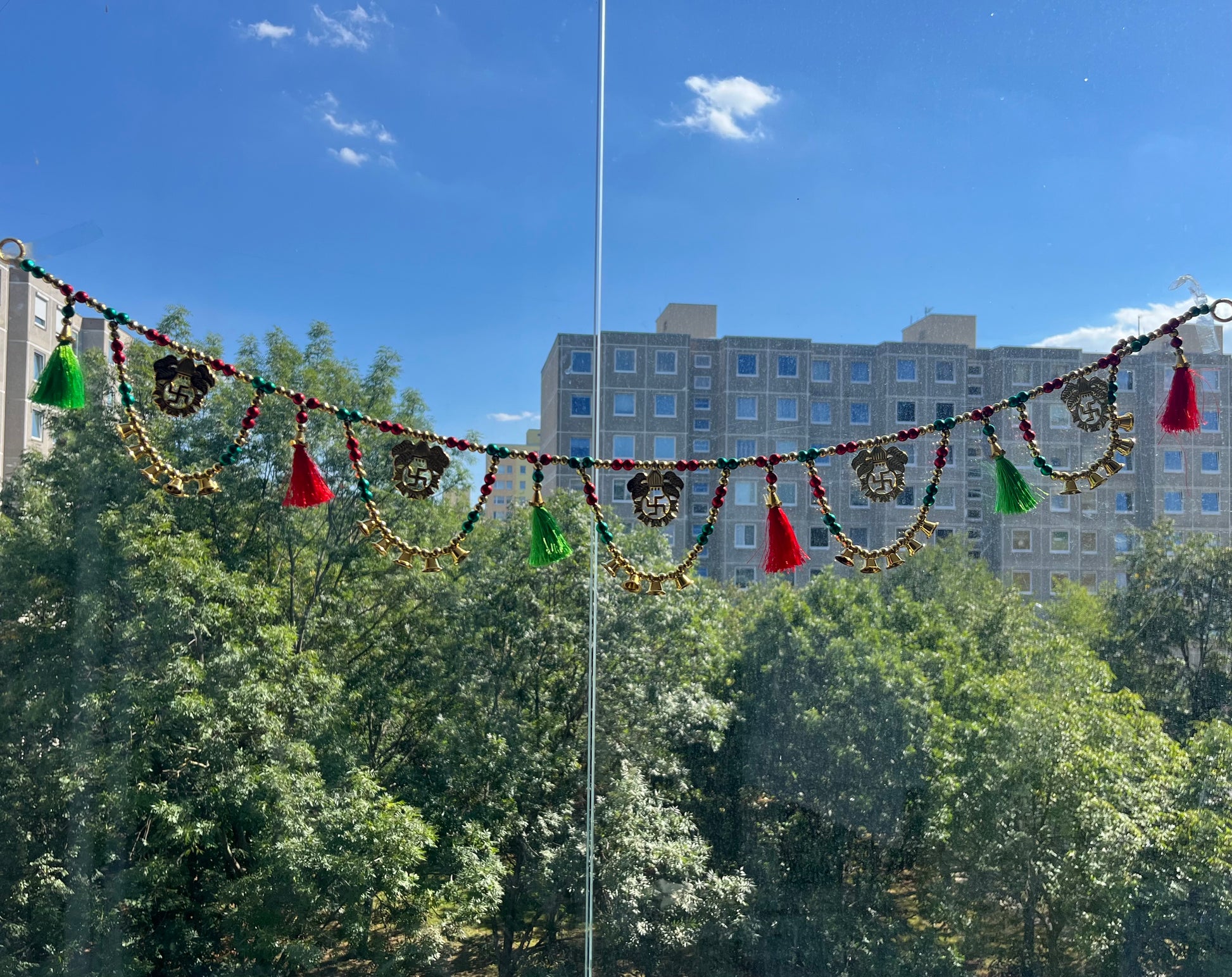 Beaded Toran Swastik Multicolor Pompom Wall Hanging (100cm) (1pc)