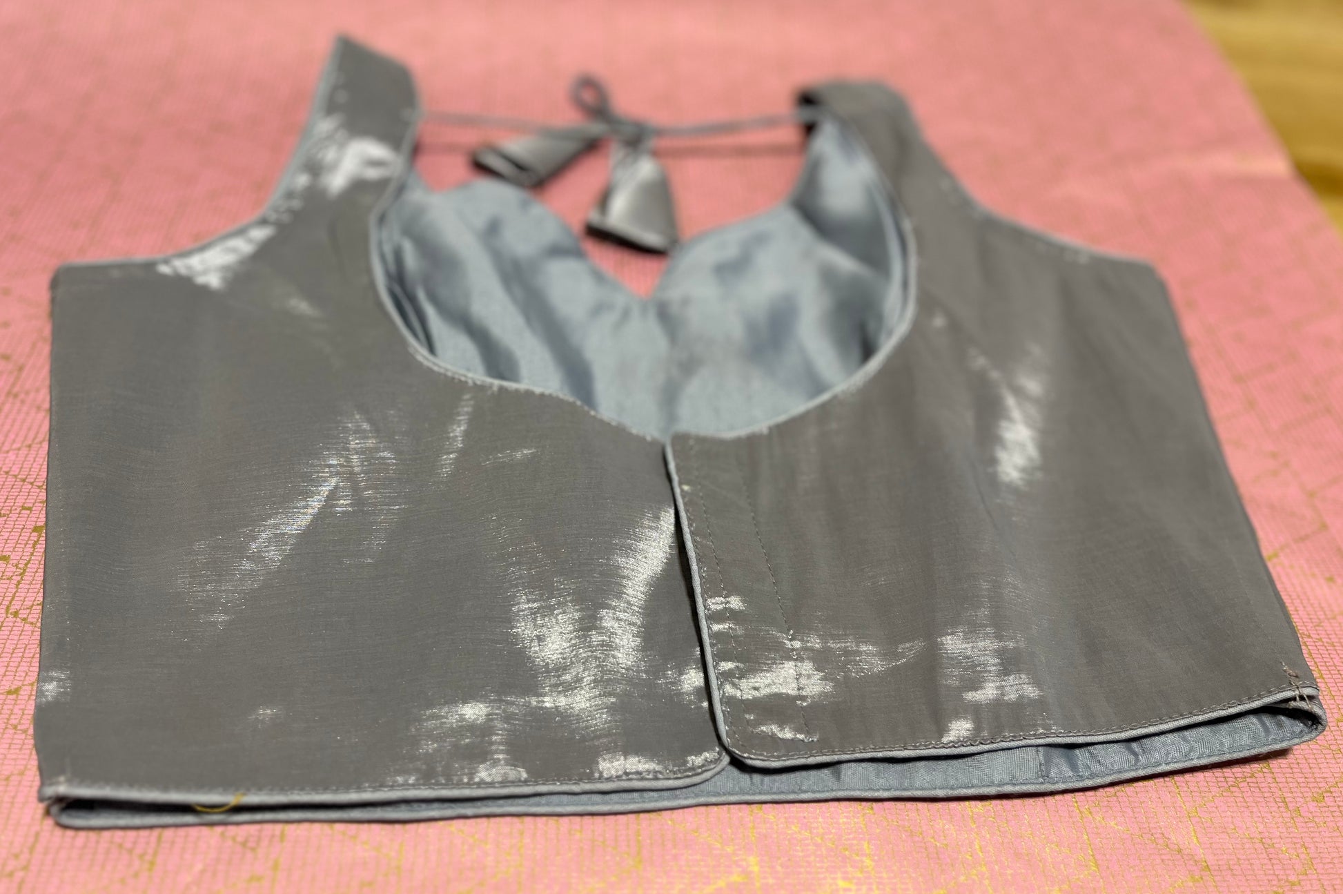 Readymade silk saree blouse in Silver plain colour, sleeveless without Padded