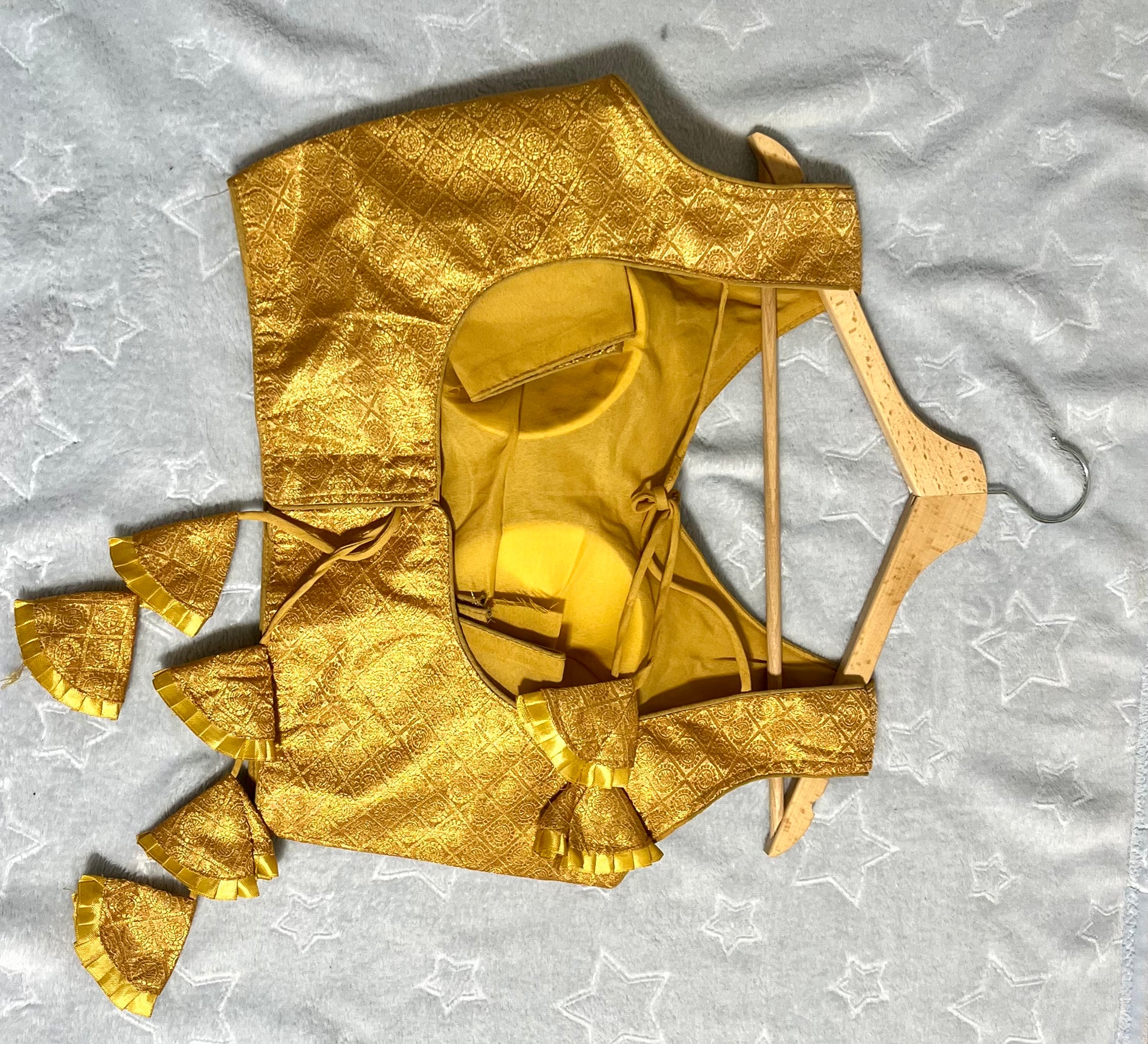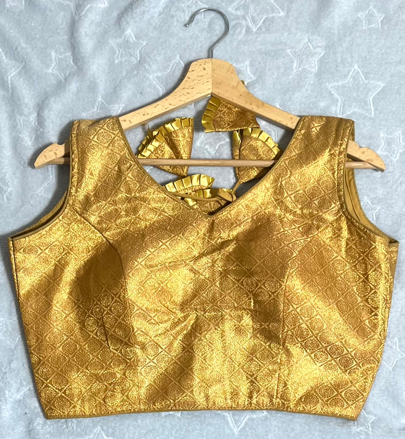 Readymade silk saree blouse in Golden colour, Sleeveless with Padded